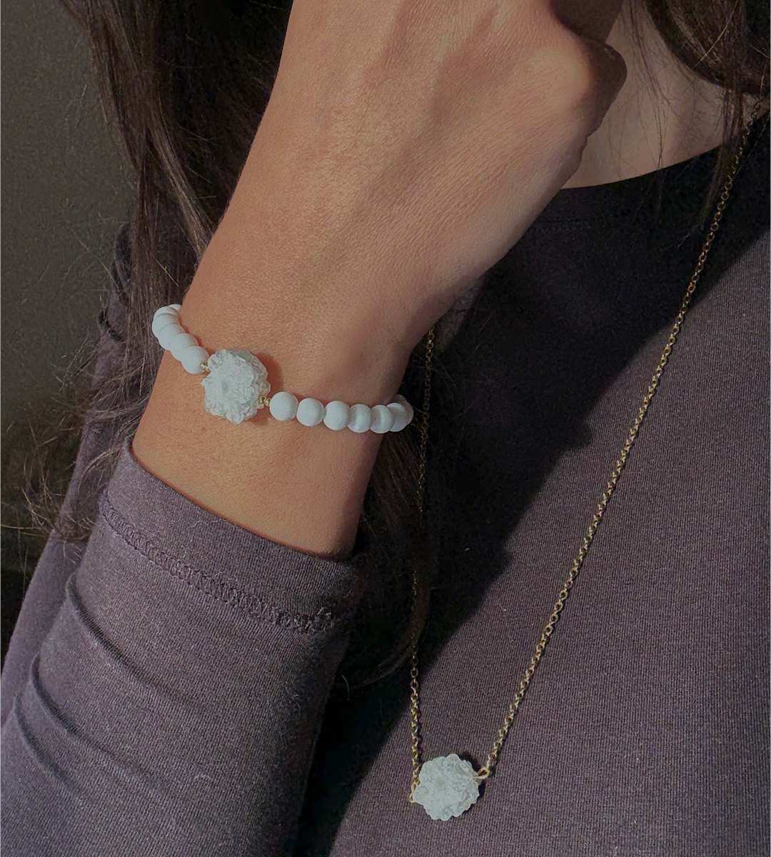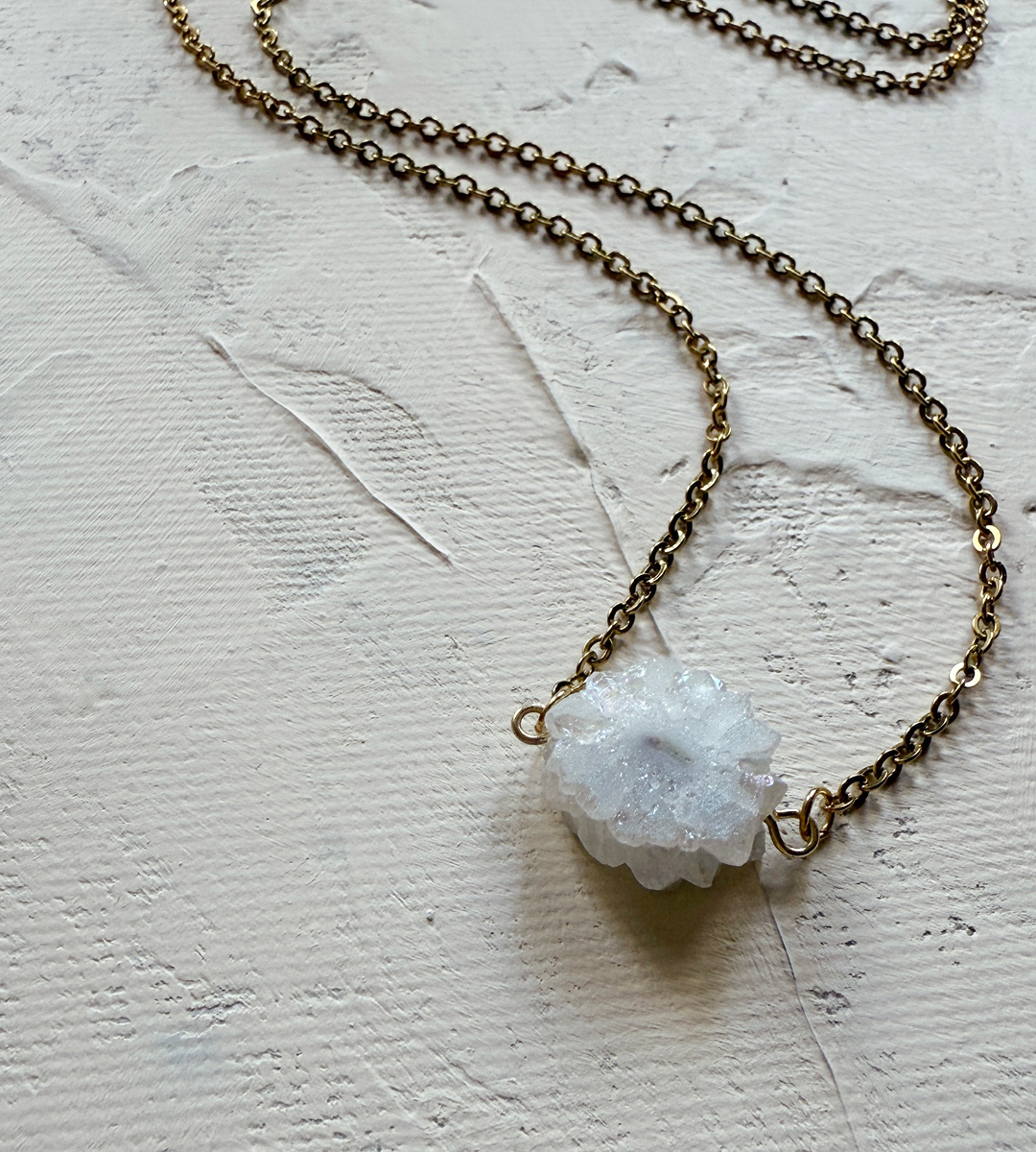 Krása krystalů ve své nejryzejší podobě, kdy každý je originál, každý je unikát, stejně jako Ty. Kouzelná bílá drúzička peříčkového achátu s jemným duhovým třpytem připomíná sněhovou vločku nebo ledovou květinu. Duhu tvoří jemné pokovení krystalu, kterému se říká také Aqua Aura. Achát je jeden z nejznámějších minerálů, který přináší klid, podporu a hluboké propojení s přírodou. Zavěšený je na jednoduchém dlouhém řetízku, aby jeho něžná podoba ještě více vynikla.