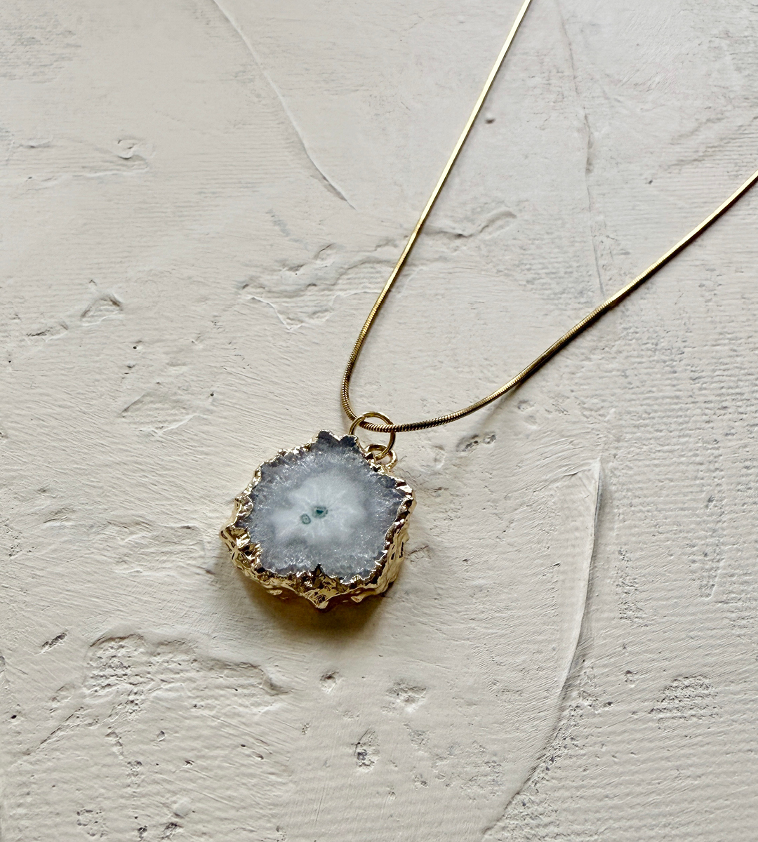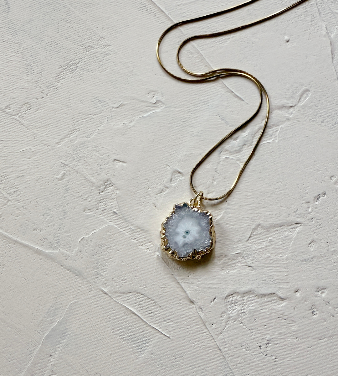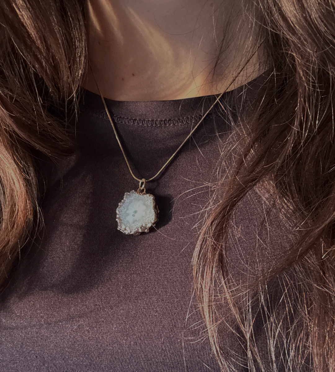 Krása krystalů ve své nejryzejší podobě, kdy každý je originál, každý je unikát, stejně jako Ty. Šedobílá pozlacená achátová drúza s drobnou zelenkavou inkluzí uprostřed je jedinečná a jen jedna. Achát je jeden z nejznámějších minerálů, který přináší klid, podporu a hluboké propojení s přírodou. Zavěšený je na minimalistickém řetízku, tzv. hadince, aby jeho jedinečnost ještě více vynikla.