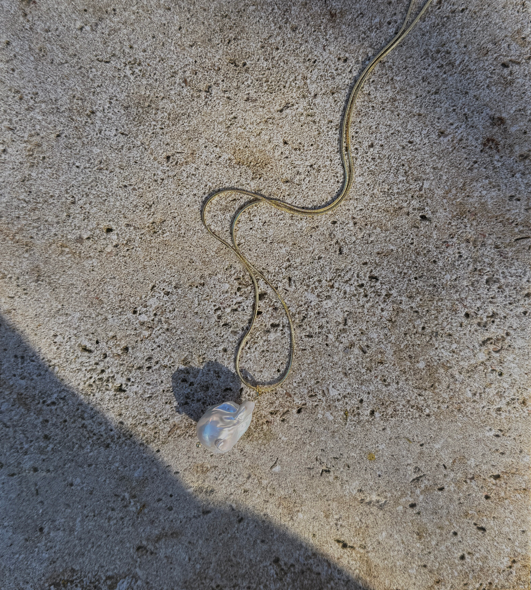 Náhrdelník Andromedé tvoří minimalistický řetízek, tzv. hadinka pozlacená 24kt zlatem, který se svou barvou nejvíce podobá pravému zlatu. Na něm je zavěšena unikátní velká barokní perla připomínající svým tvarem ocas závojnatky. Jednoduché a nadčasové propojení, které unosíš na den i noc, a se kterým budeš zářit jako bájná Andromeda...