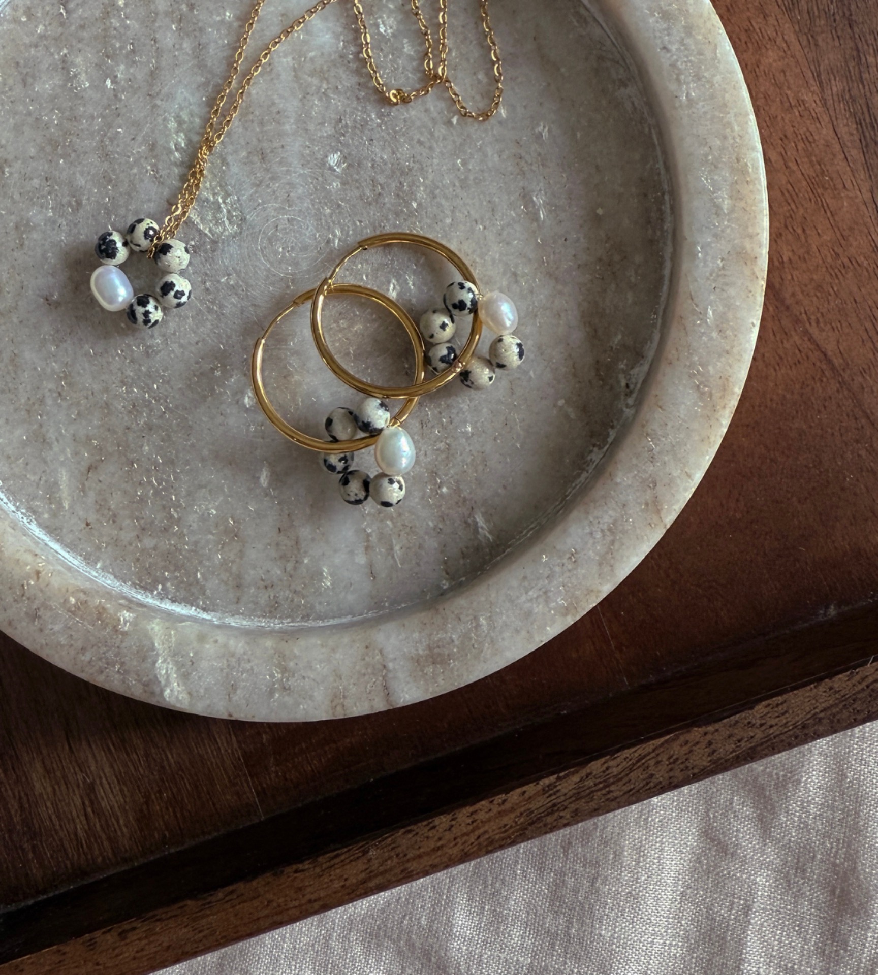 Okouzlující krása a čistota perel propojená s živostí a zemitostí dalmatinského jaspisu. Téhle kombinaci nešlo odolat. Jednoduchý design a netradiční soulad dvou rozmanitých esencí přináší radost, optimismus, rovnováhu a harmonii. Energie, která září i uvnitřňuje zároveň. Taková je nová kolekce, ve které najdeš éterické náušnice a řetízek na krk s perlou a jaspisem poskládaným do drobné kytičky, stejně hravý prstýnek i půlený choker náhrdelník s minimalistickým náramkem. Kombinovat můžeš dle libosti, protože i přes svůj kontrast stále zůstává jemná a decentní.