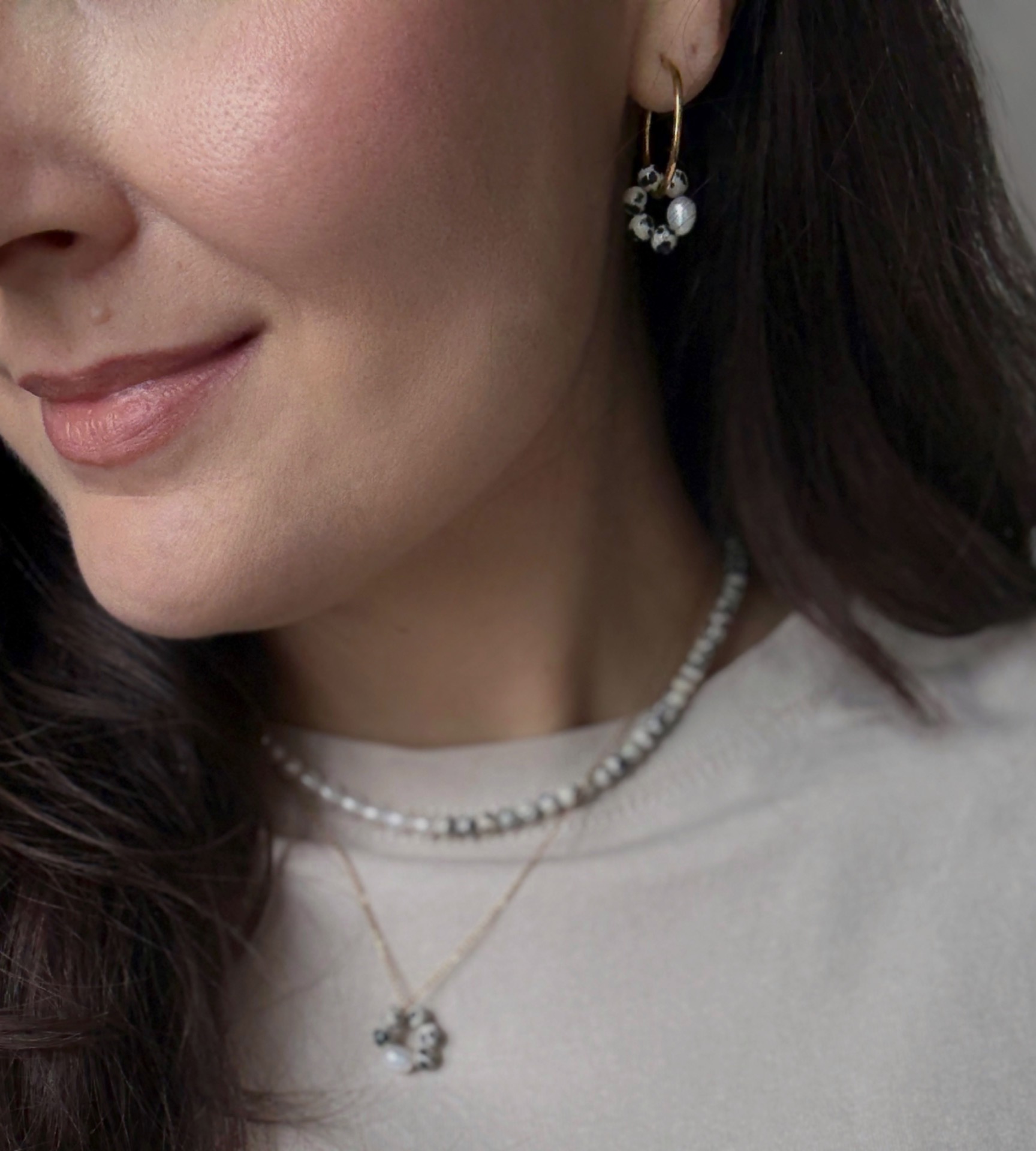 Okouzlující krása a čistota perel propojená s živostí a zemitostí dalmatinského jaspisu. Téhle kombinaci nešlo odolat. Jednoduchý design a netradiční soulad dvou rozmanitých esencí přináší radost, optimismus, rovnováhu a harmonii. Energie, která září i uvnitřňuje zároveň. Taková je nová kolekce, ve které najdeš éterické náušnice a řetízek na krk s perlou a jaspisem poskládaným do drobné kytičky, stejně hravý prstýnek i půlený choker náhrdelník s minimalistickým náramkem. Kombinovat můžeš dle libosti, protože i přes svůj kontrast stále zůstává jemná a decentní.