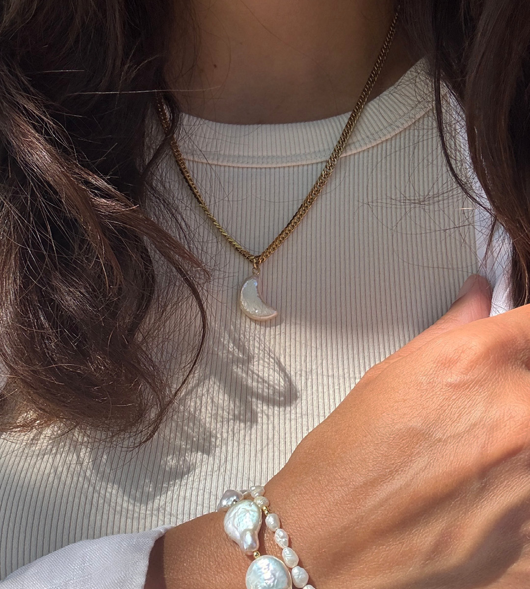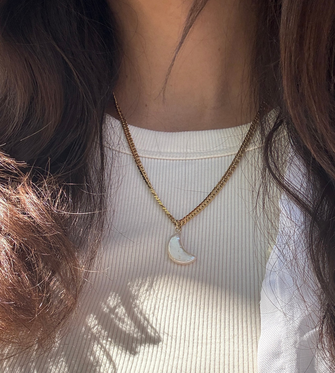 Jedinečná perla ve tvaru půlměsíce s nepravidelným povrchem na masivním pozlaceném řetízku. Nečekané propojení ve zcela moderním pojetí, taková je Luné. Něžná, jemná, a silná a nepřehlédnutelná zároveň. Nově k ní v kolekci najdeš také náušnice.