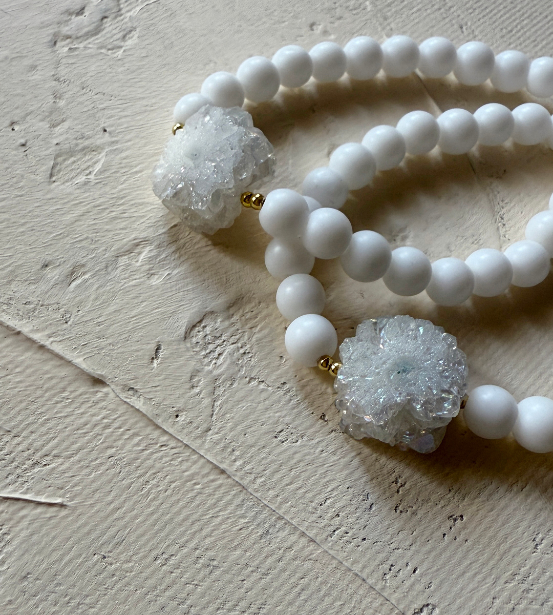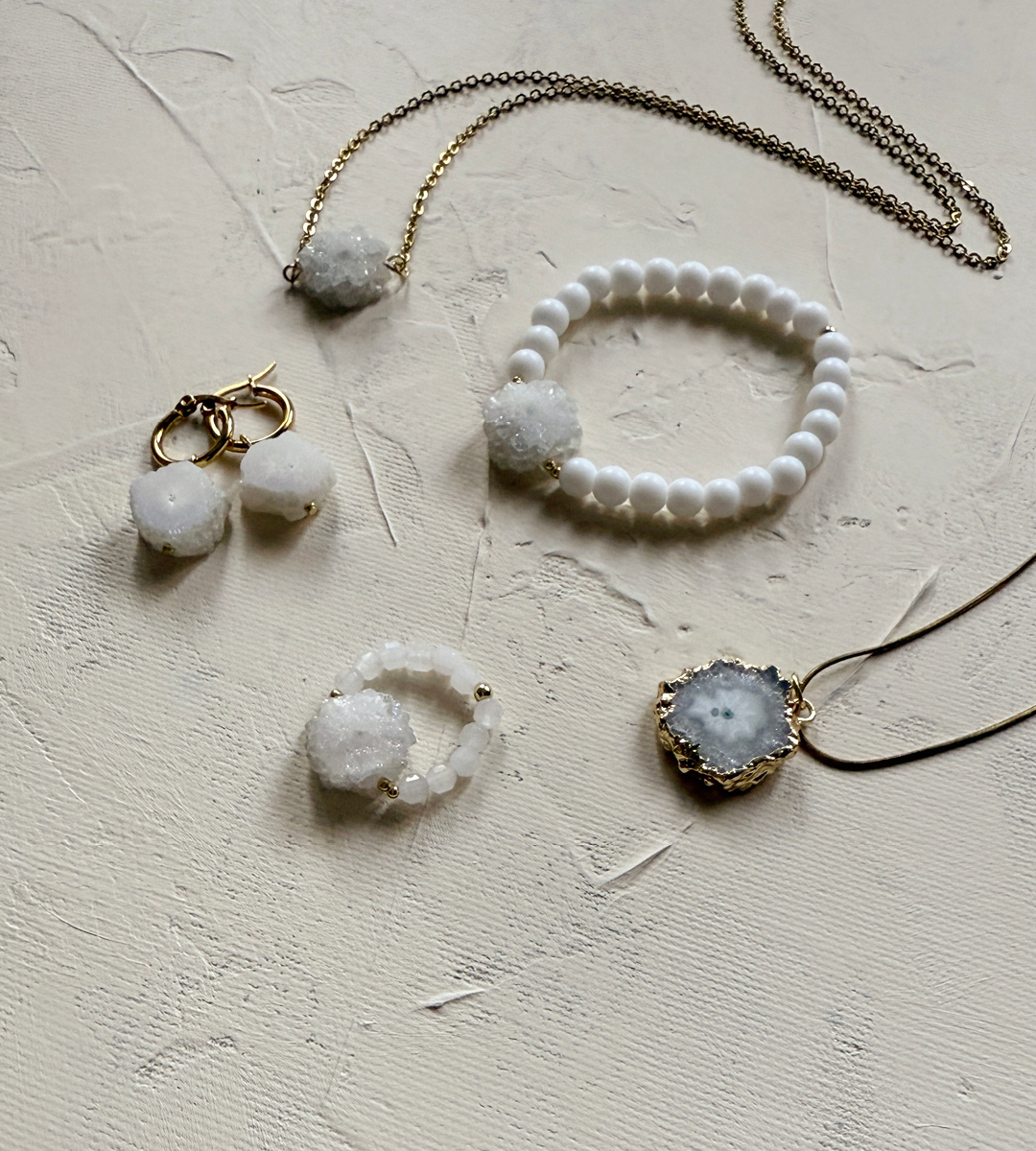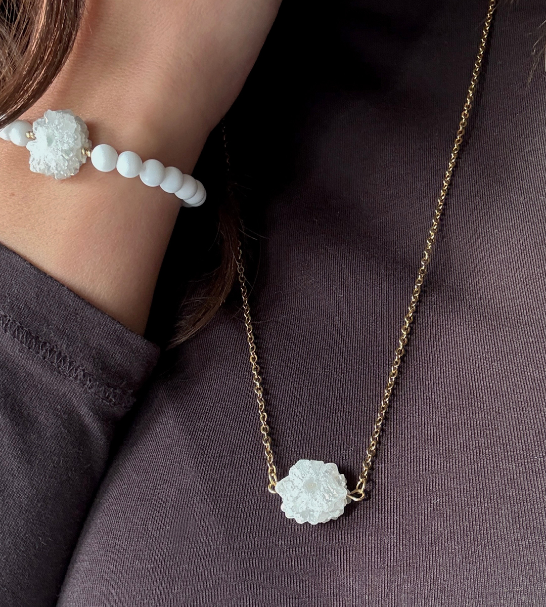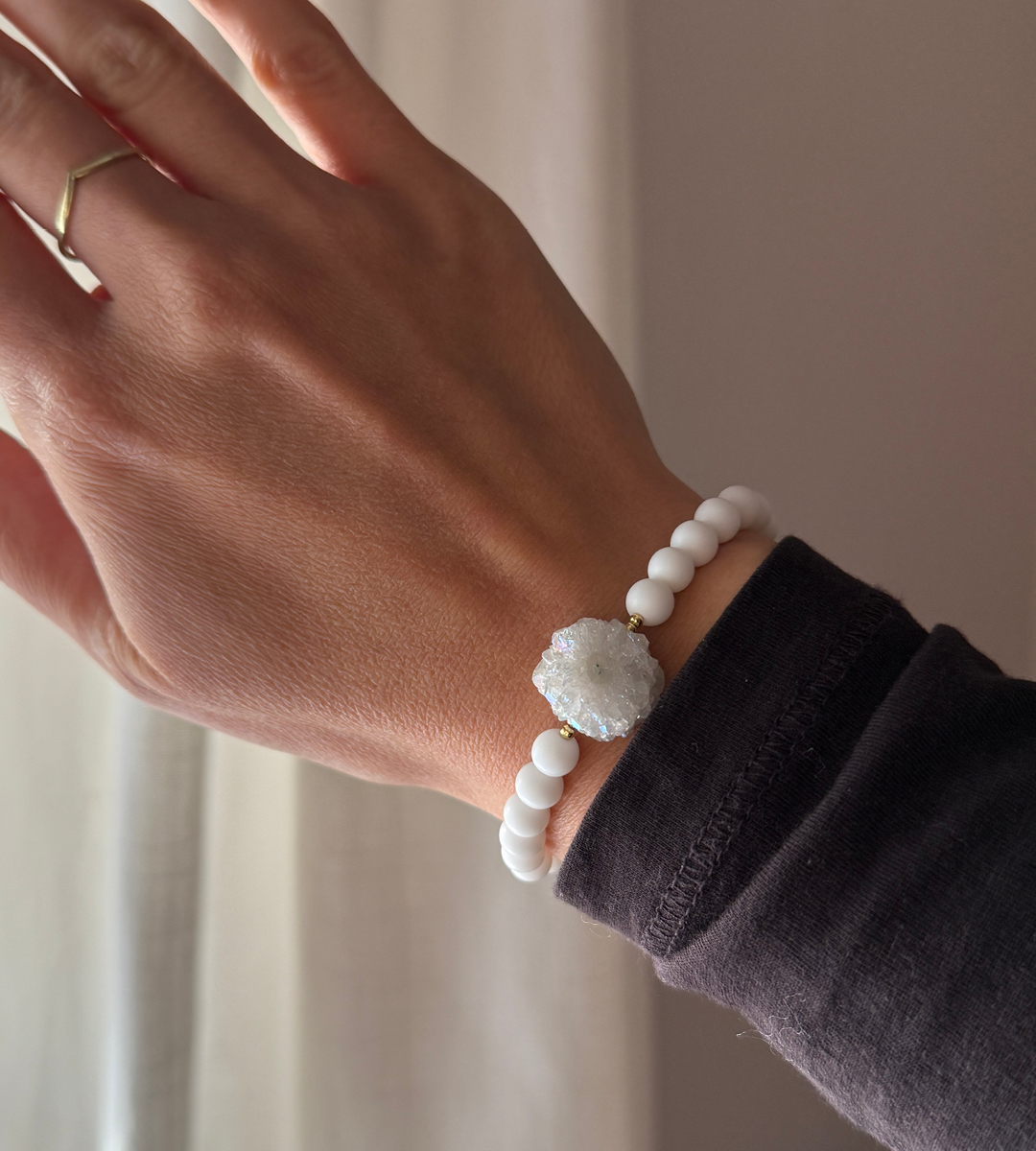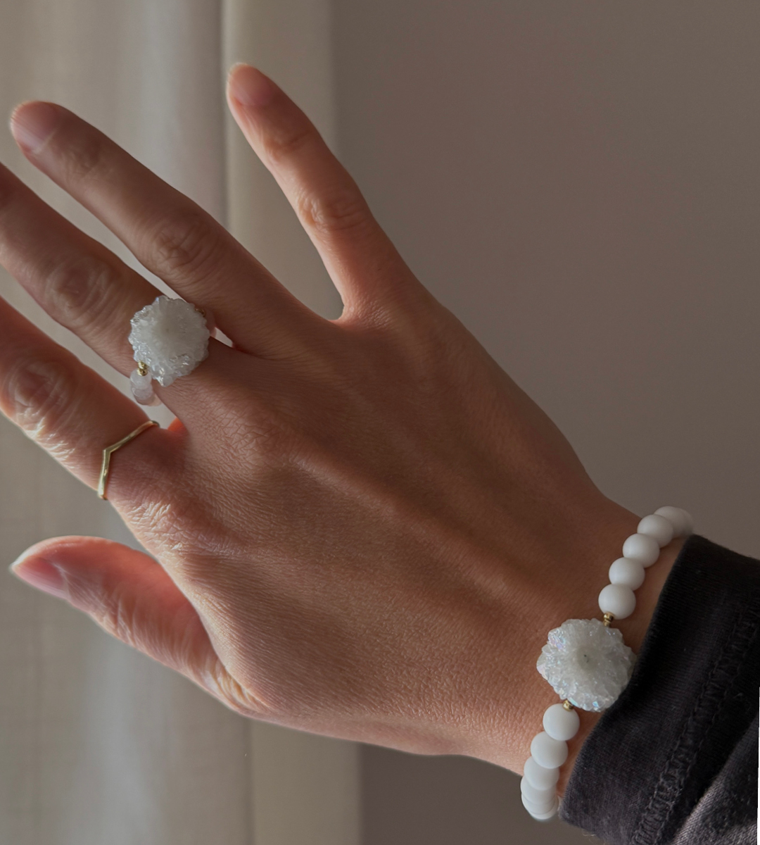 Krása krystalů ve své nejryzejší podobě, kdy každý je originál, každý je unikát, stejně jako Ty. Kouzelná bílá drúzička peříčkového achátu s jemným duhovým třpytem připomíná sněhovou vločku nebo ledovou květinu. Duhu tvoří jemné pokovení krystalu, kterému se říká také Aqua Aura. Achát je jeden z nejznámějších minerálů, který přináší klid, podporu a hluboké propojení s přírodou. Doplněný je o matný bílý jadeit, který je prastarým ochranným kamenem, aby jeho něžná podoba ještě více vynikla.