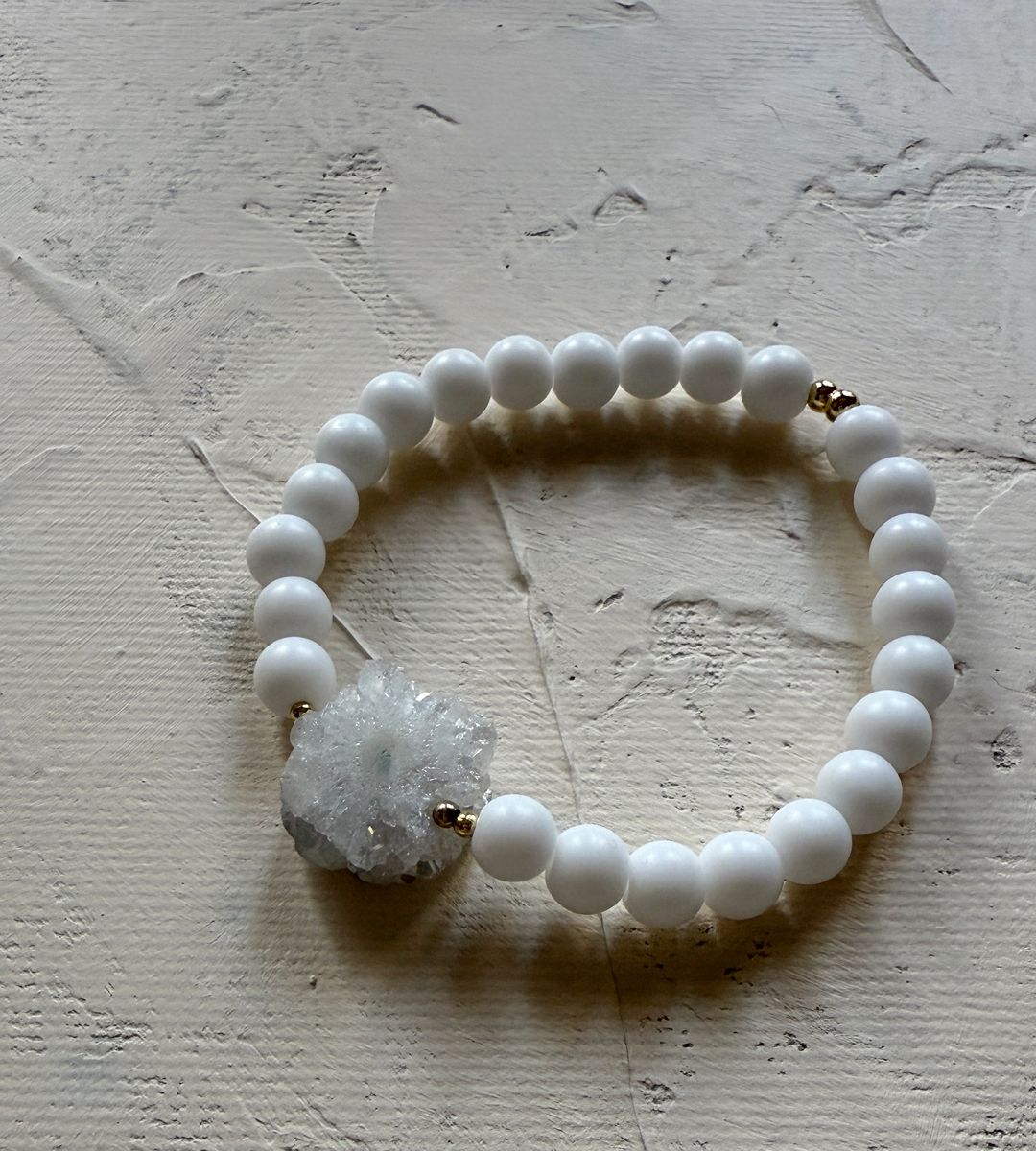 Materiál: Achátová drůza, pozlacená nerez ocel, přírodní jadeit, pružný vlasec