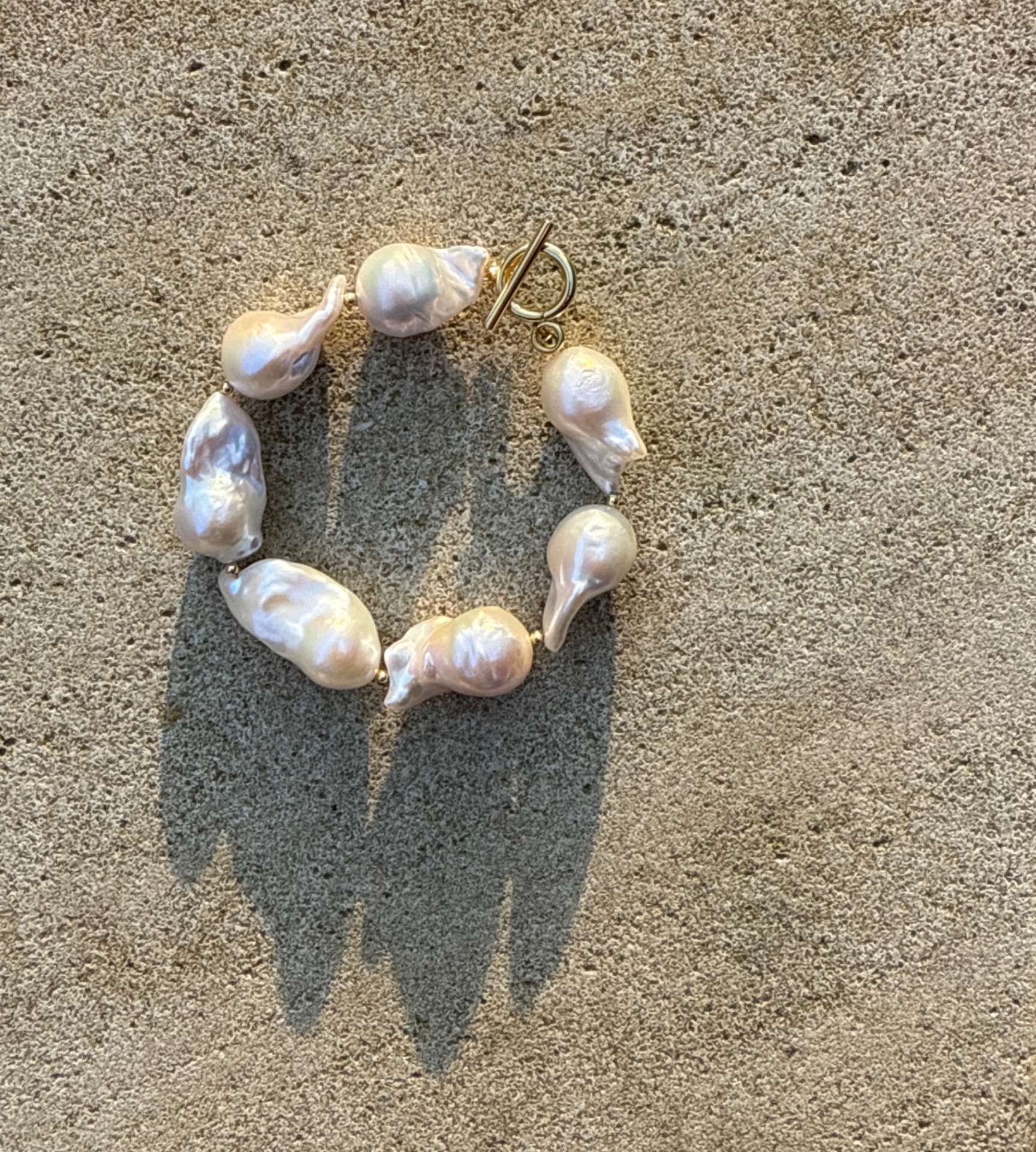 Náramek Aphrodité je celý složený z unikátních velkých oblých barokních perel, které jsou neopakovatelné a jedny jediné v celé kolekci. Vynikají pravidelnějším podlouhým tvarem a mléčným leskem. Prokládané jsou drobnými pozlacenými korálky doplněné o minimalistické americké zapínání pozlacené 24kt zlatem, které zde zároveň plní i funkci estetickou, a svou barvou se nejvíce podobá pravému zlatu. Je tak jedním z nejkrásnějších šperků, které jsi mohla na Resonans doposud spatřit.