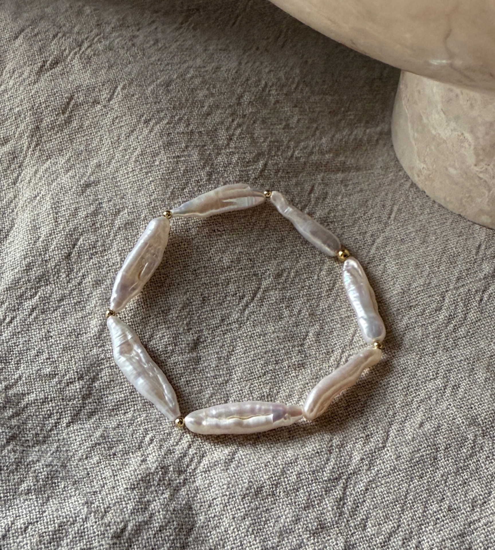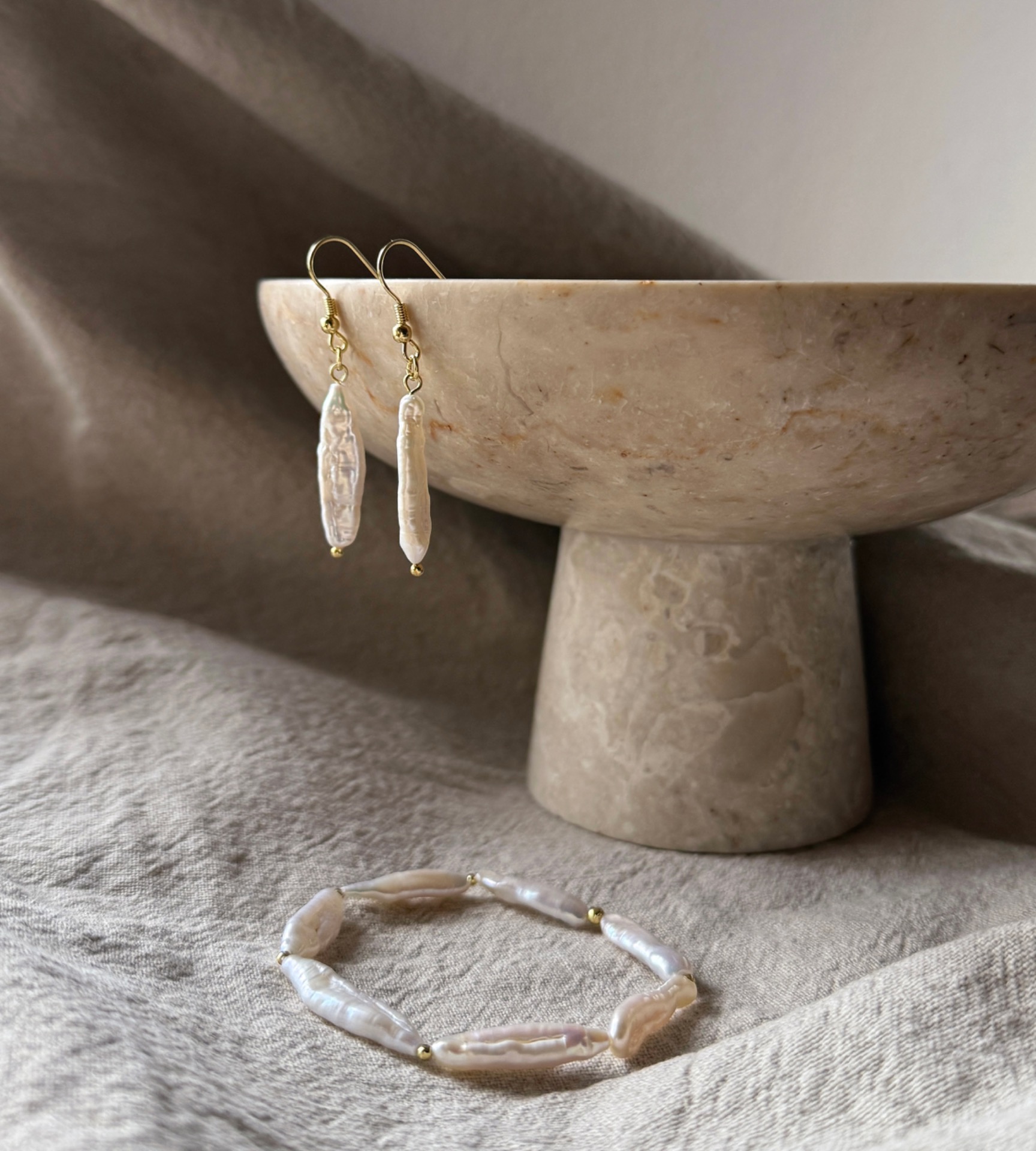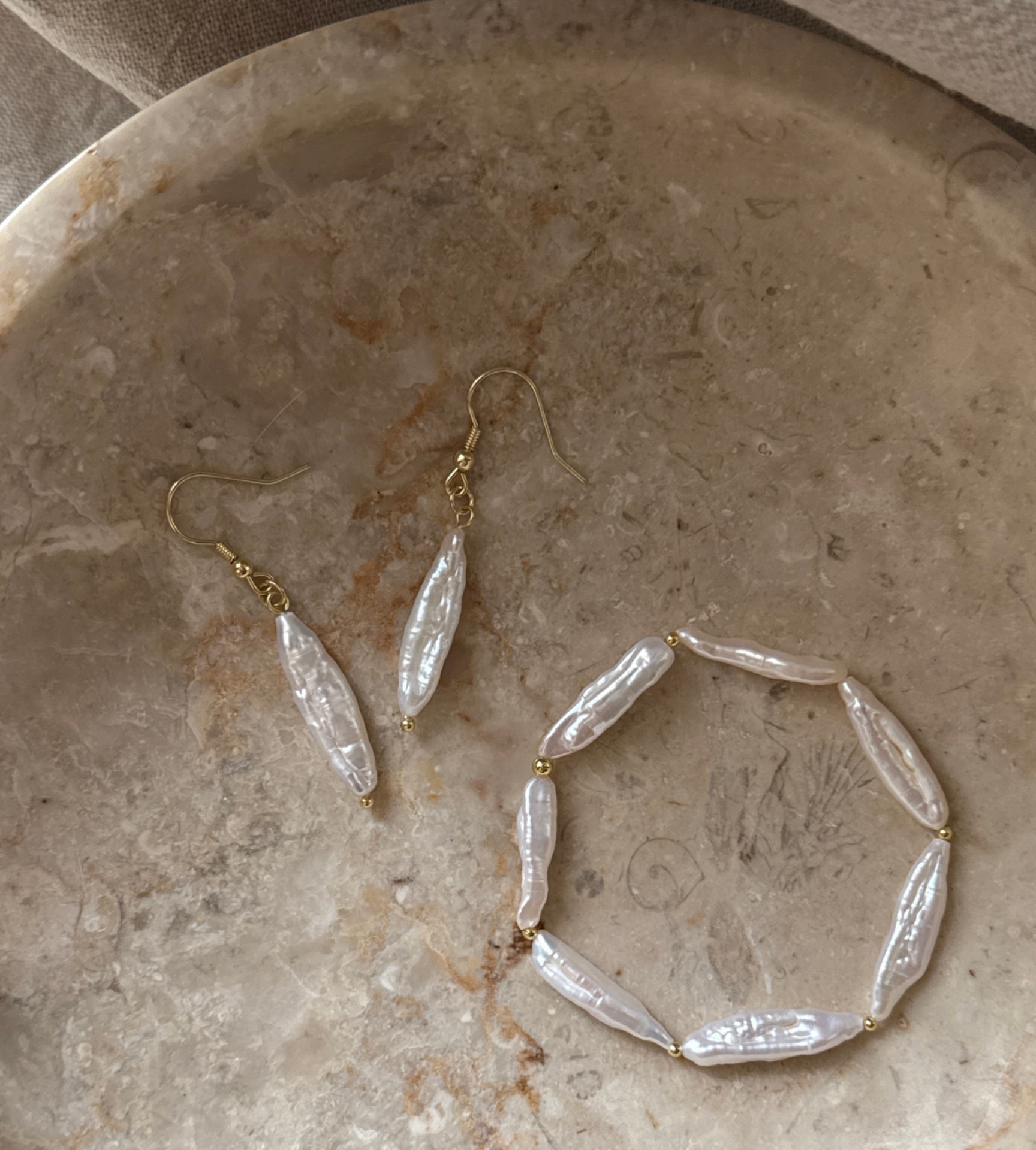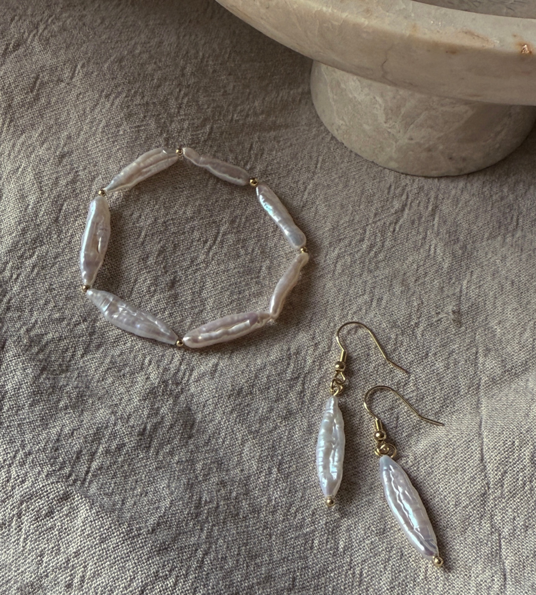 Když necháš přírodu promlouvat za Tebe... Unikátní podlouhlé nepravidelné Biwa perly s duhovým leskem připomínají svými organickými tvary a liniemi na povrchu listy exotických rostlin. Jejich sofistikovanost a osobitá krása je jemně podtržena drobnými pozlacenými korálky, kterými jsou prokládány na náramku, a najdeš je i na éterických stejnojmenných náušnicích.