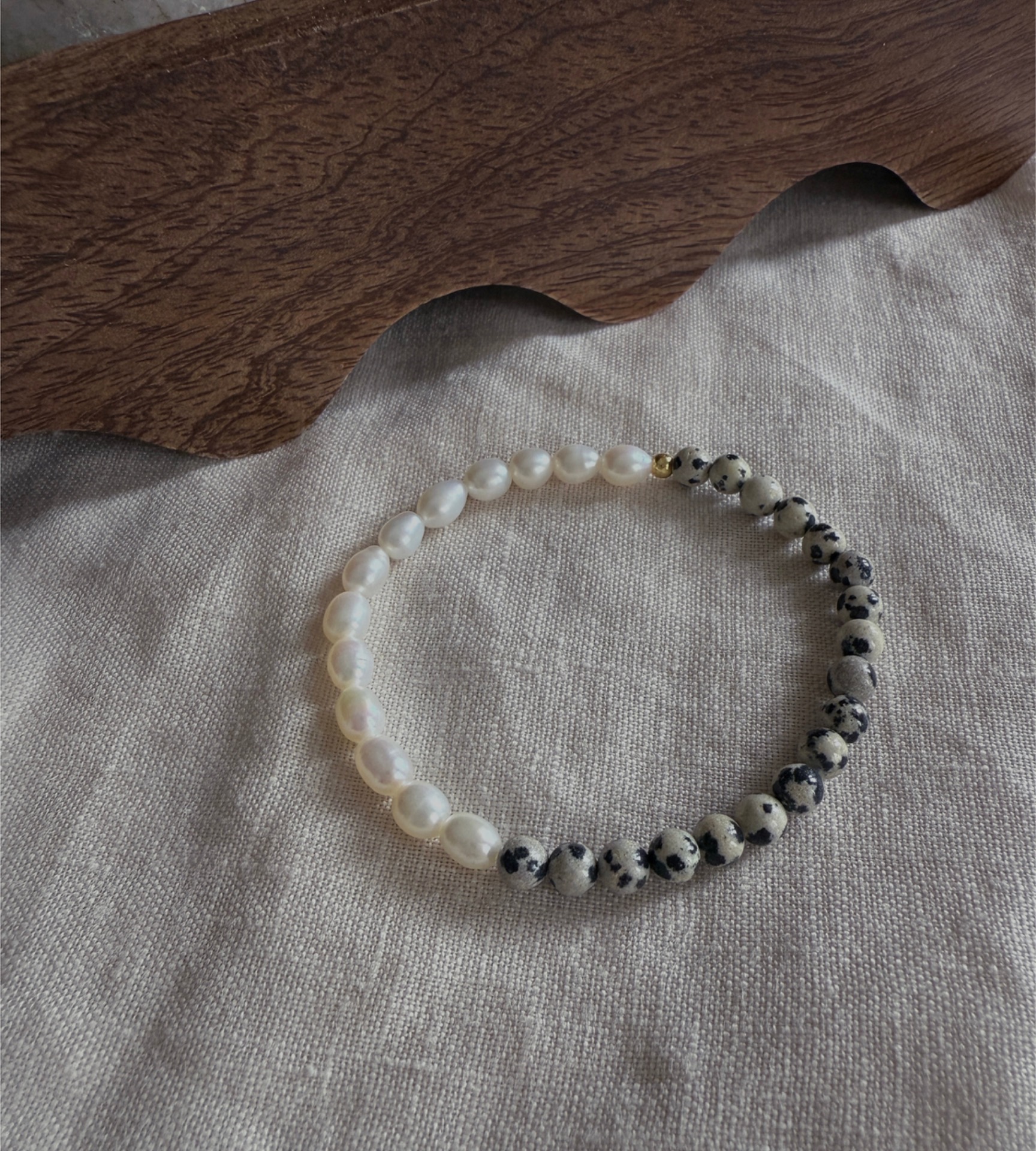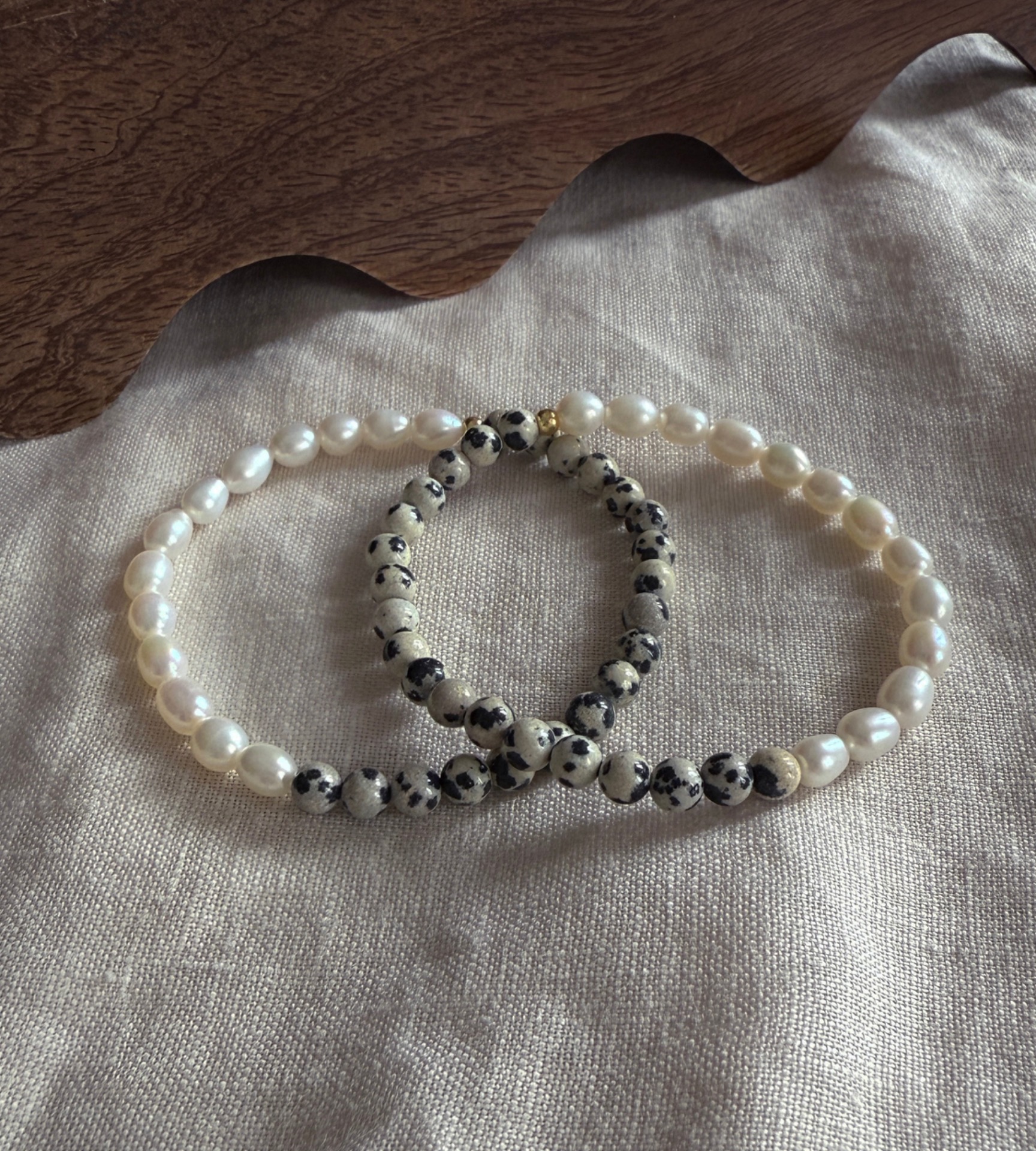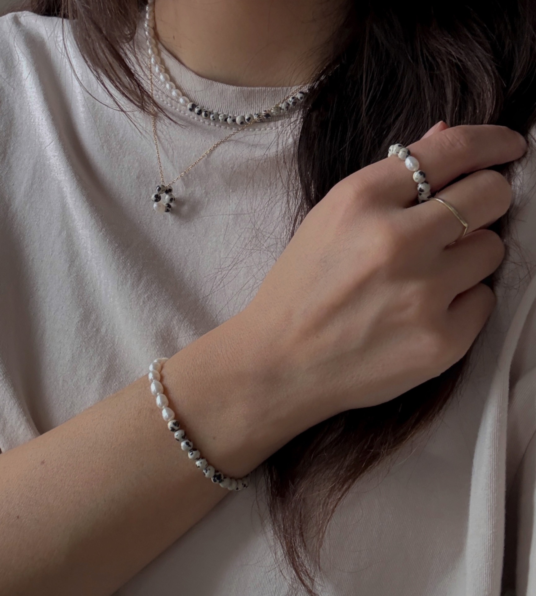 Okouzlující krása a čistota perel propojená s živostí a zemitostí dalmatinského jaspisu. Téhle kombinaci nešlo odolat. Jednoduchý design a netradiční soulad dvou rozmanitých esencí přináší radost, optimismus, rovnováhu a harmonii. Energie, která září i uvnitřňuje zároveň. Taková je nová kolekce, ve které najdeš éterické náušnice a řetízek na krk s perlou a jaspisem poskládaným do drobné kytičky, stejně hravý prstýnek i půlený choker náhrdelník s minimalistickým náramkem. Kombinovat můžeš dle libosti, protože i přes svůj kontrast stále zůstává jemná a decentní.