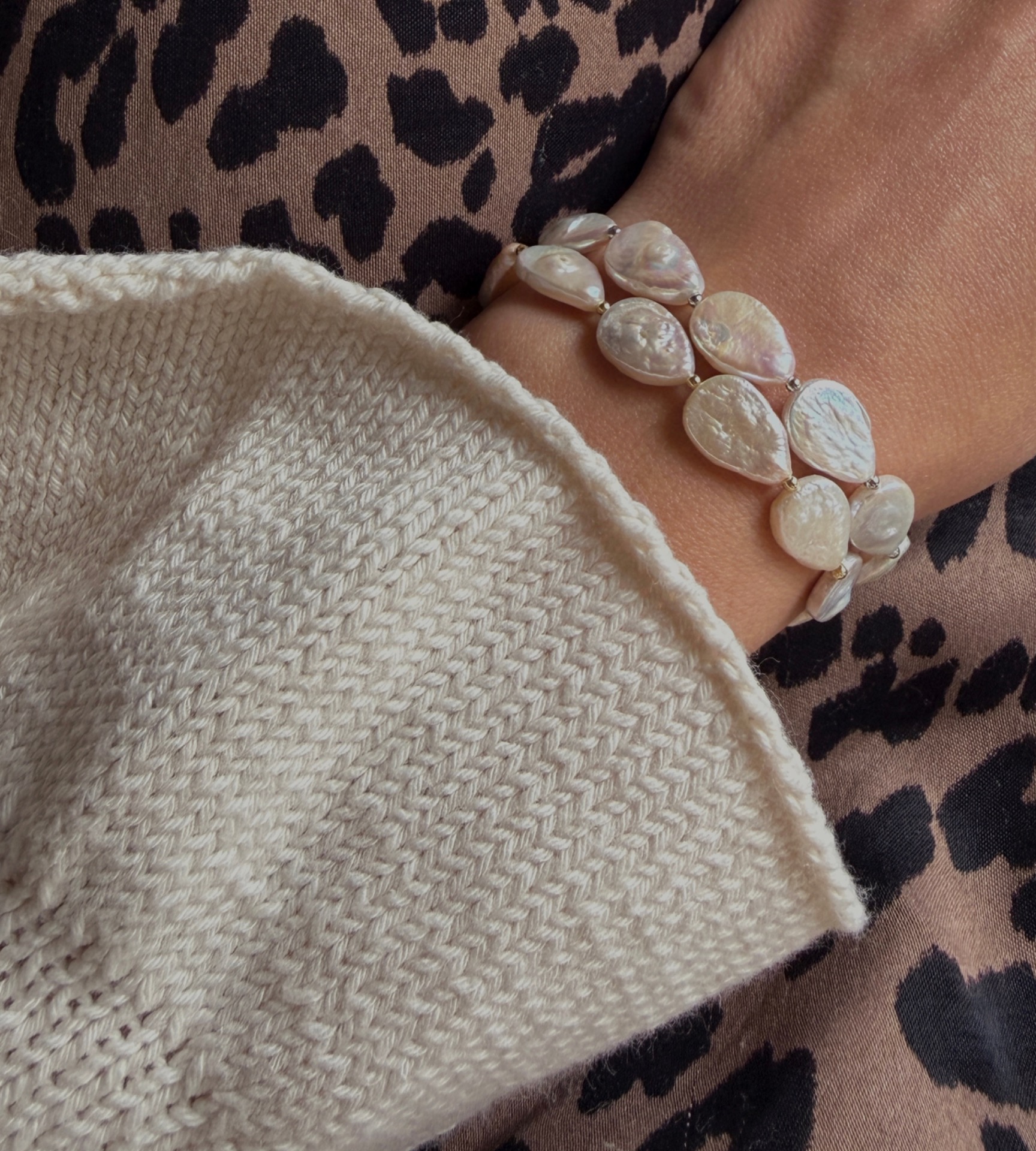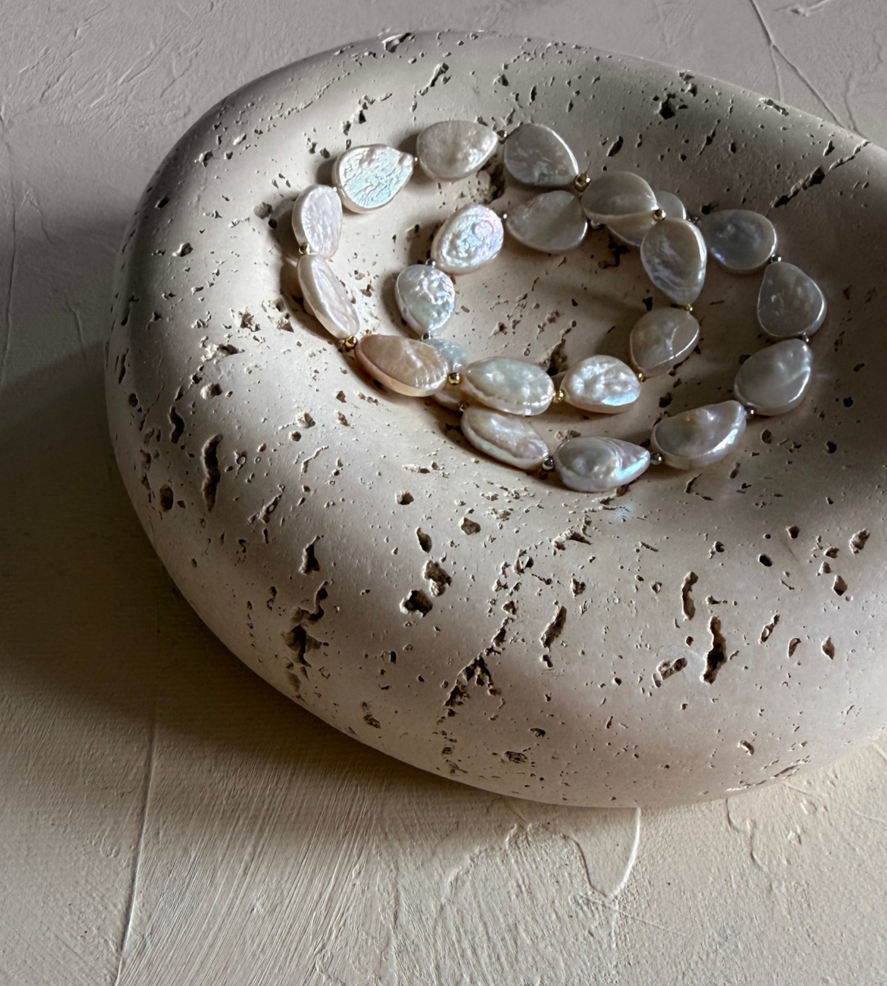Voda jako hlavní element, nejen díky perlám samotným, ale také díky jejich netradičnímu tvaru. Kouzelné kapky prokládané pozlacenými korálky Tě rázem přenesou k Tvému oblíbenému jezeru, moři či oceánu vždy, když se na ně podíváš. Zůstanou jen vzpomínky, Ty a jejich čarokrásný třpyt, klid i divokost, odpočinek i neustálá proměna. Obojí je součástí, stačí se jen nechat na jejich vlně nést.