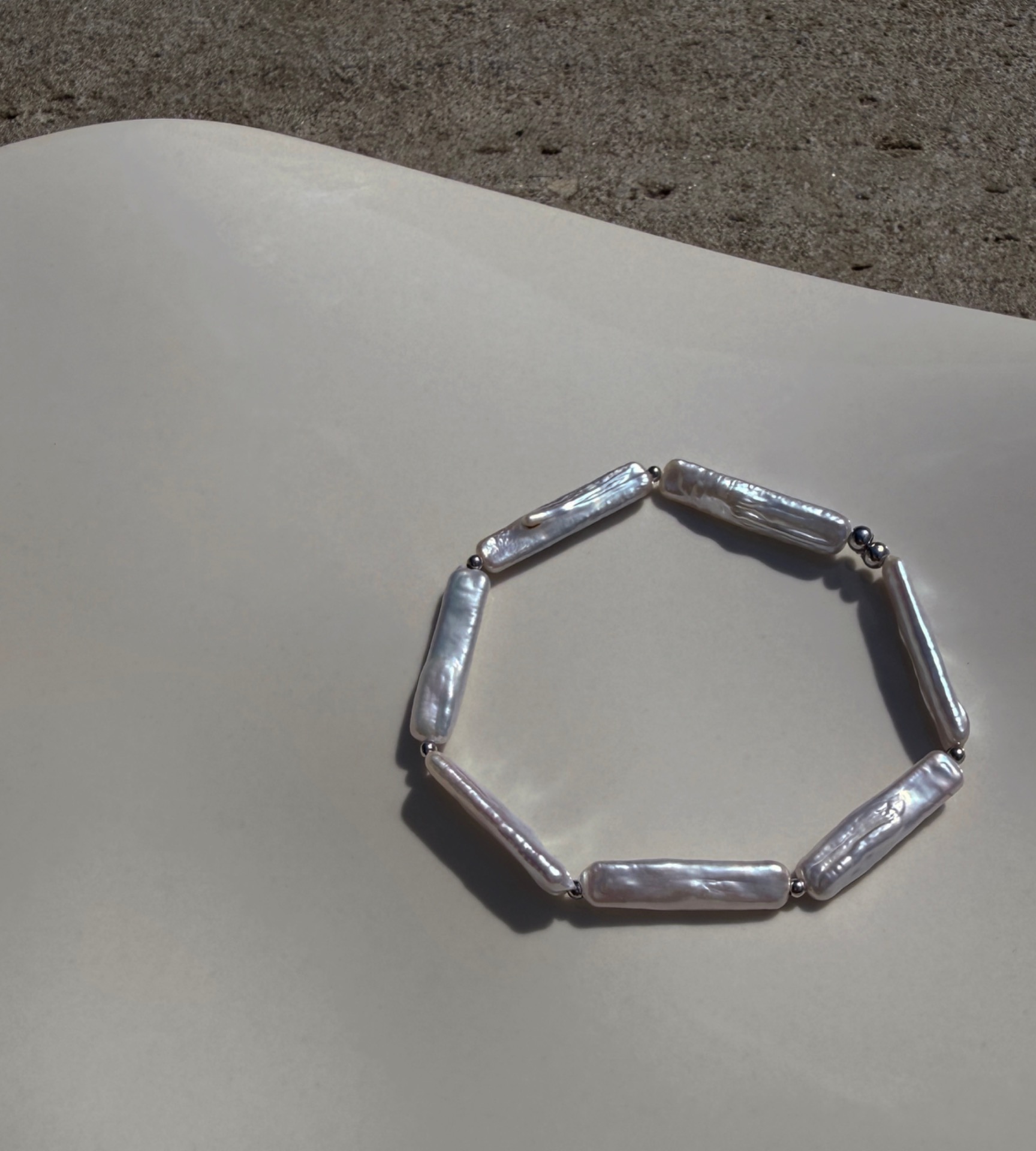 Unikátní podlouhé Biwa perly s vysokým leskem jsou výjimečným pokladem a ikonický šperkem, o kterém si šeptají i vodní dévy Néreidy. Lehkost, jasnost a jemný řád je esencí tohoto náramku, který je solitérem sám osobě i nádherně doplní jakýkoliv další kousek.
