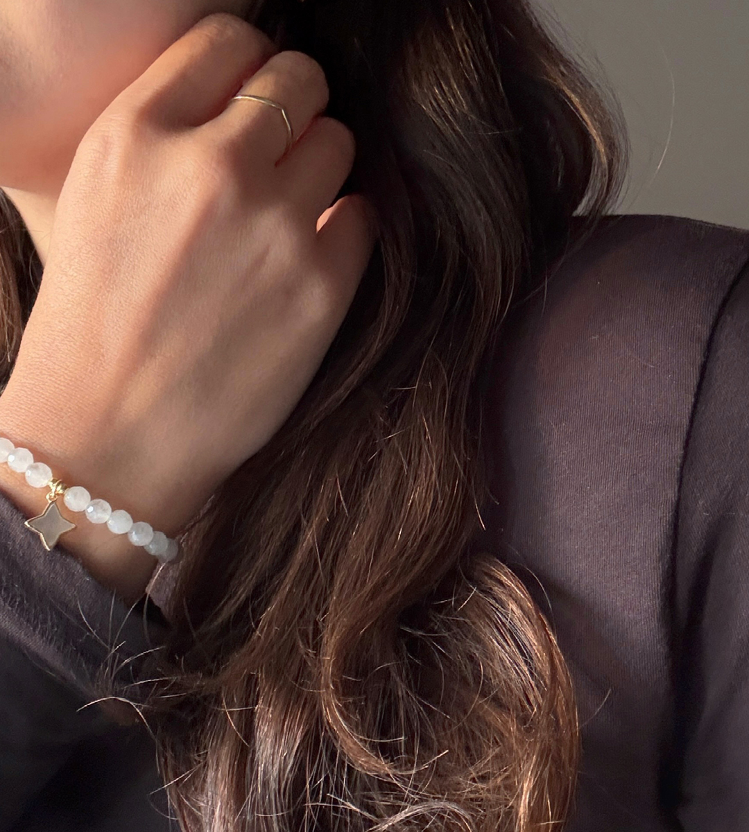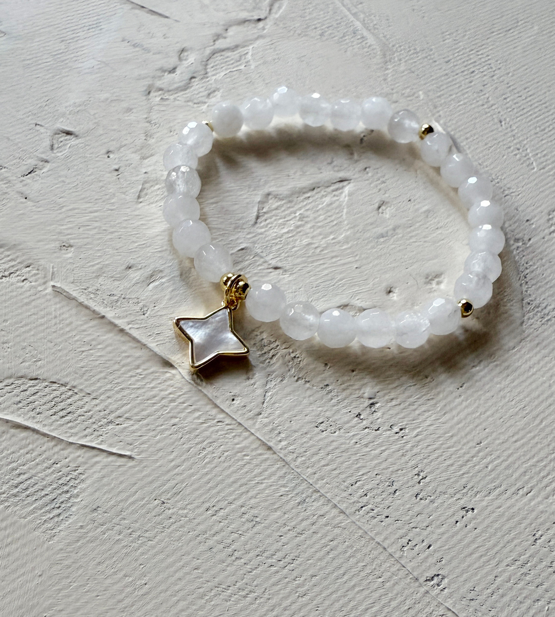 Hvězda, která Ti září na cestu. Perleťový přívěšek s něžným duhovým odleskem je doplněný o mléčné broušené korálky jadeitu, který je prastarým ochranným kamenem a symboliku podpory, ochrany rovnováhy společně s esencí čistoty a světla ještě více umocňuje.