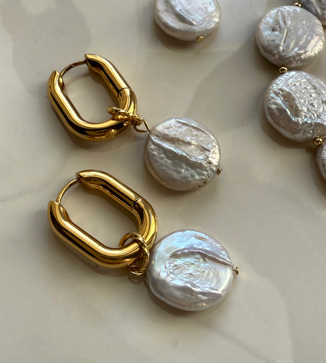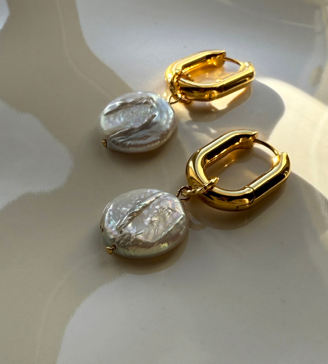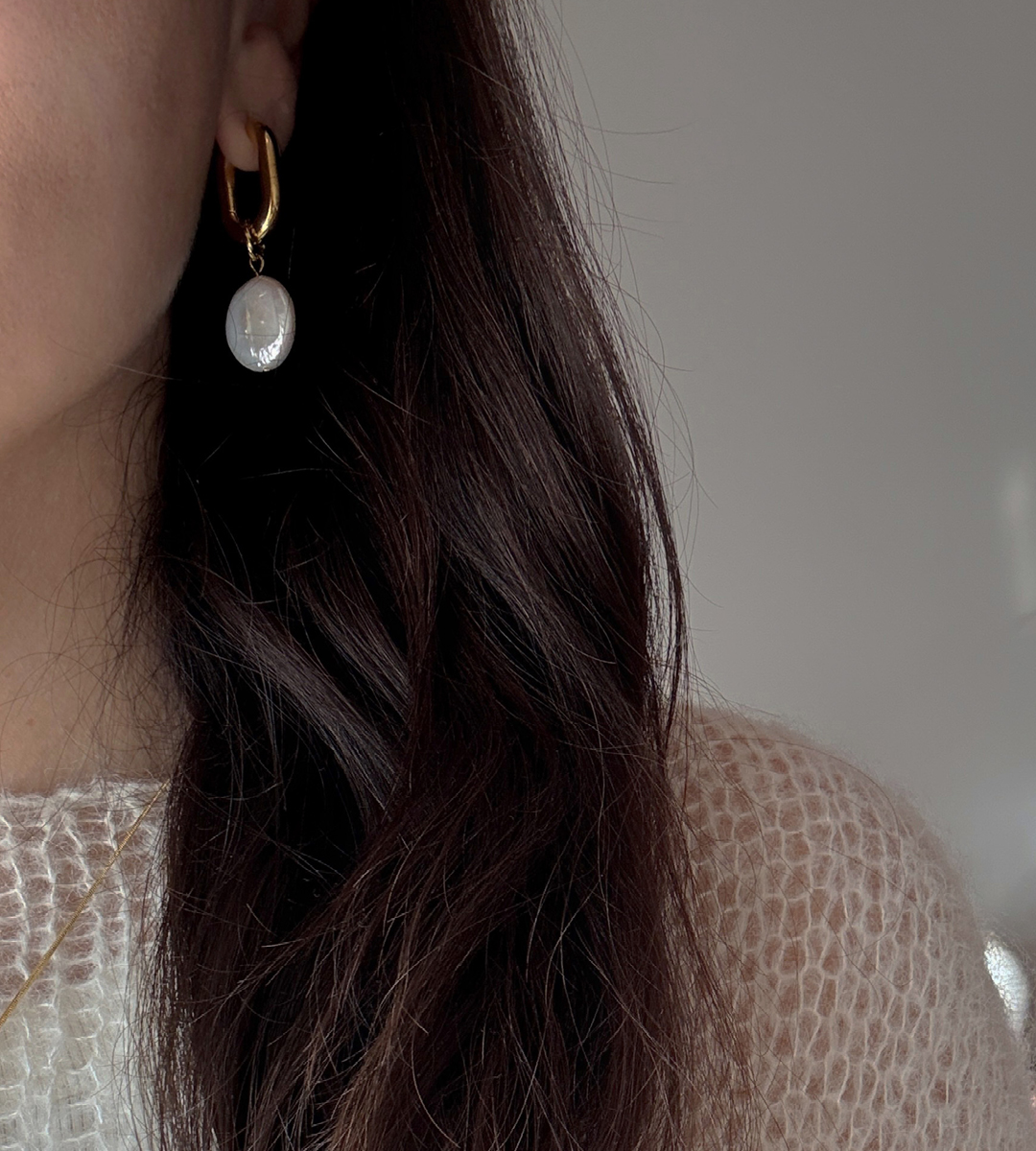 Jedinečná Biwa perlu v netradičním kruhovém tvaru s polomatným leskem a lehkým reliéfem je doplněna o pozlacený kroucený kroužek zavěšený na výrazných masivních oválných náušnicích. Pro všechny milovnice sofistikovaného minimalismu, nečekaných detailů a osobité ženskosti s jemným nádechem geometrie.