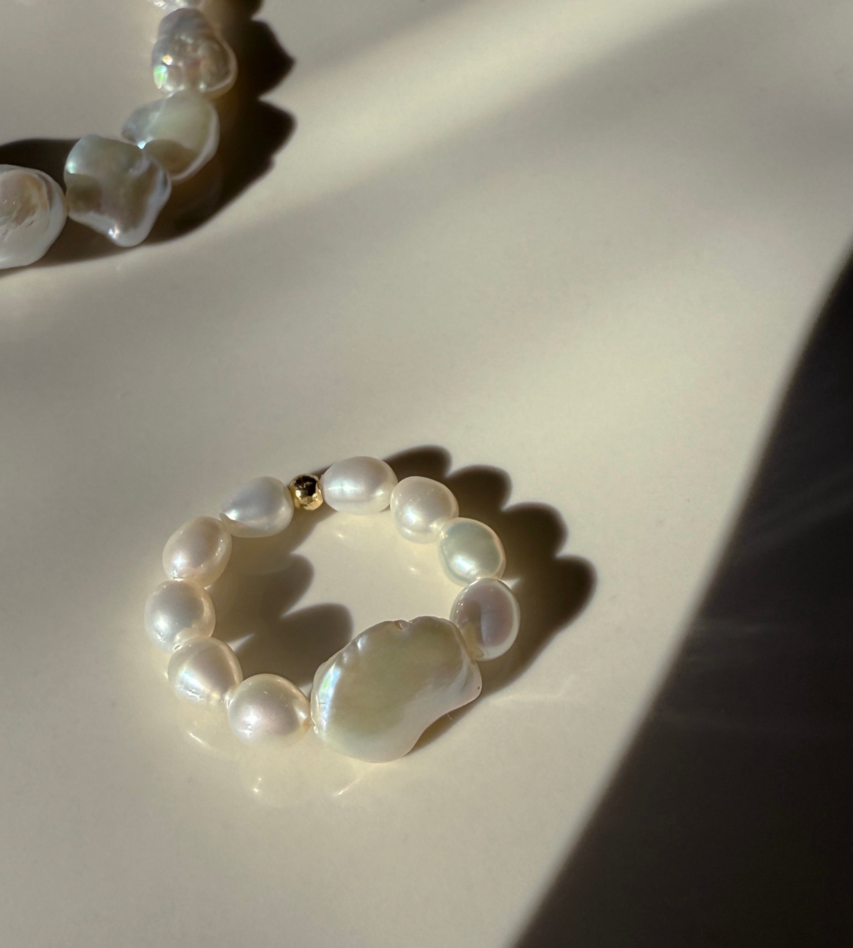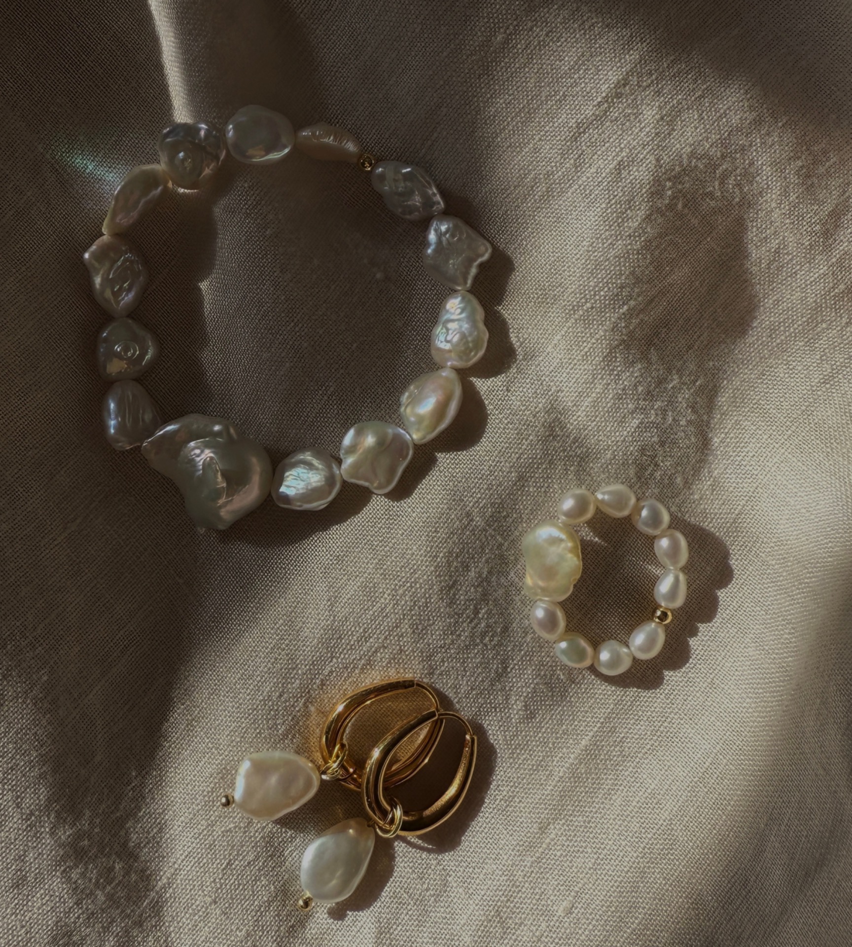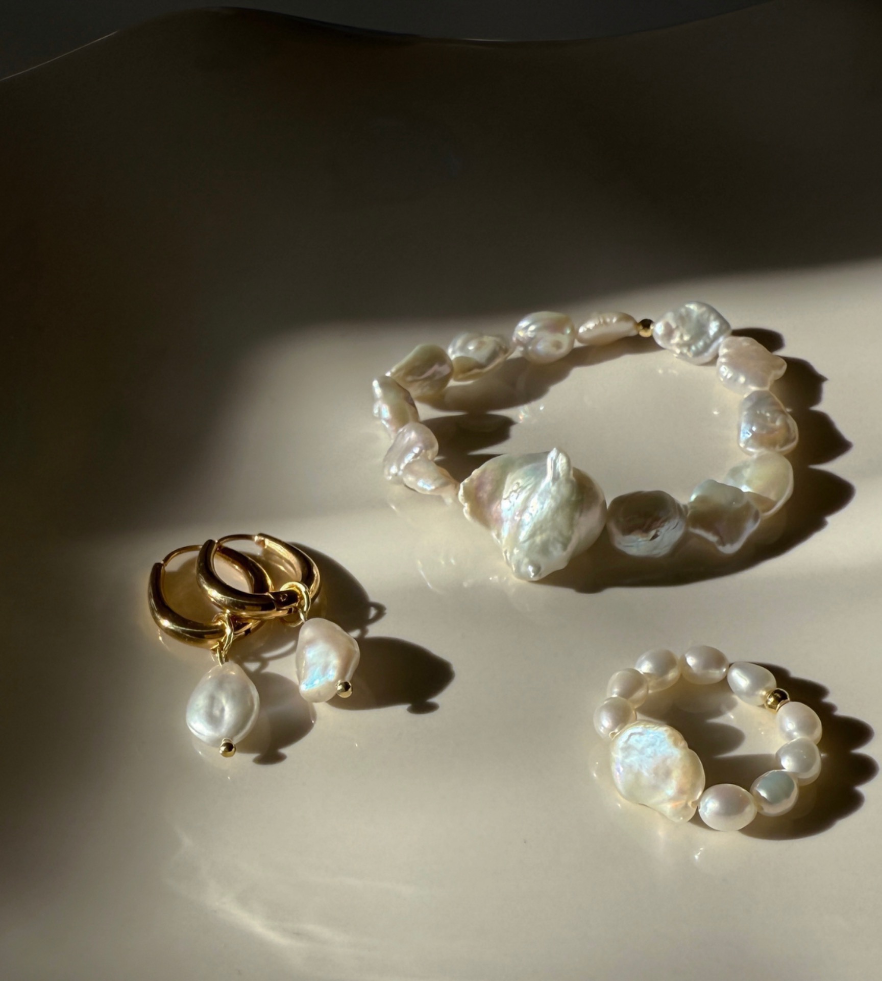 Do setu k prstýnku najdeš také stejnojmenný náramek a náušnice nebo jím krásně doplníš další šperky tvořené ze stejných oblých perliček, které se opakují napříč kolekcí.